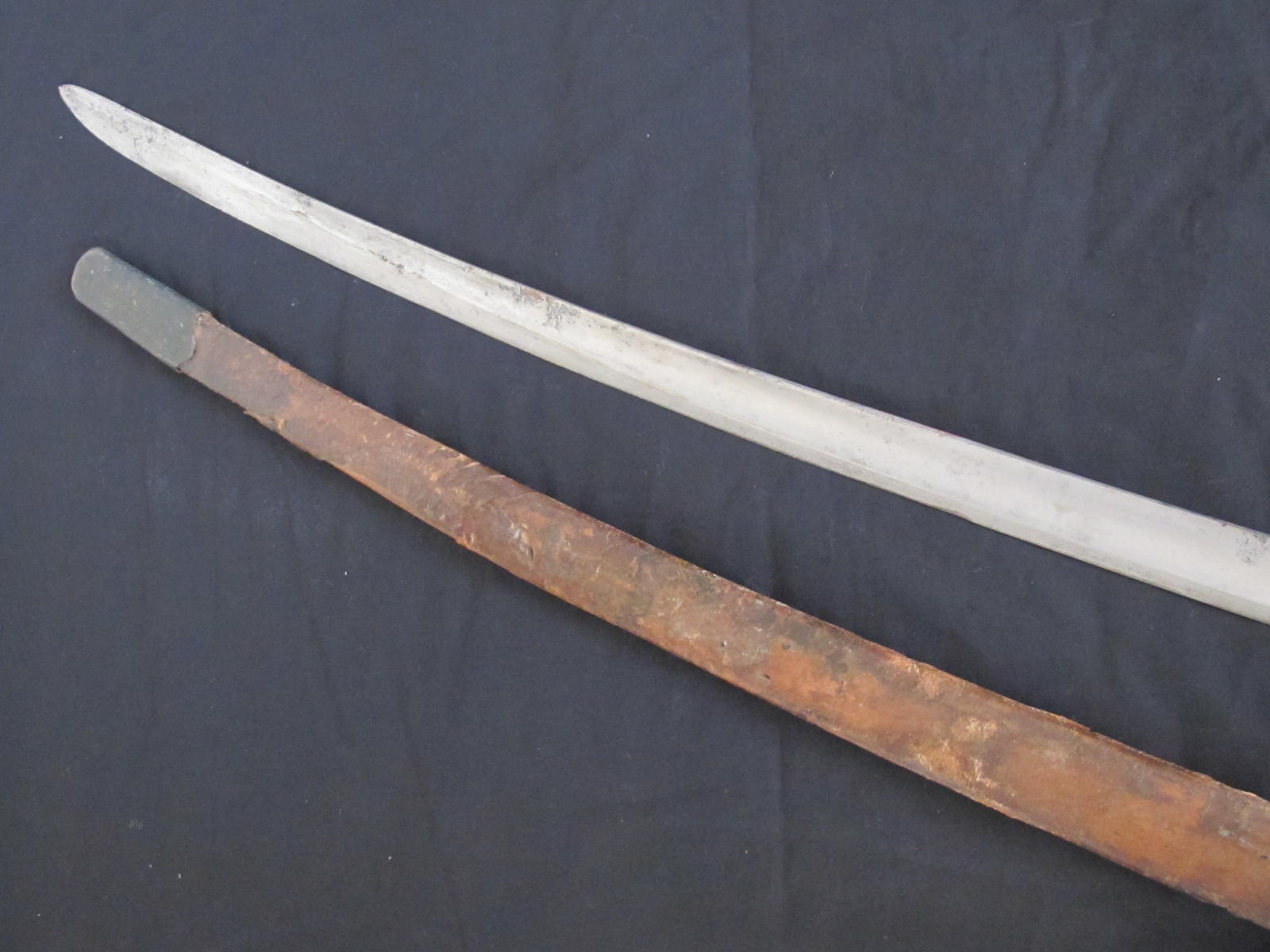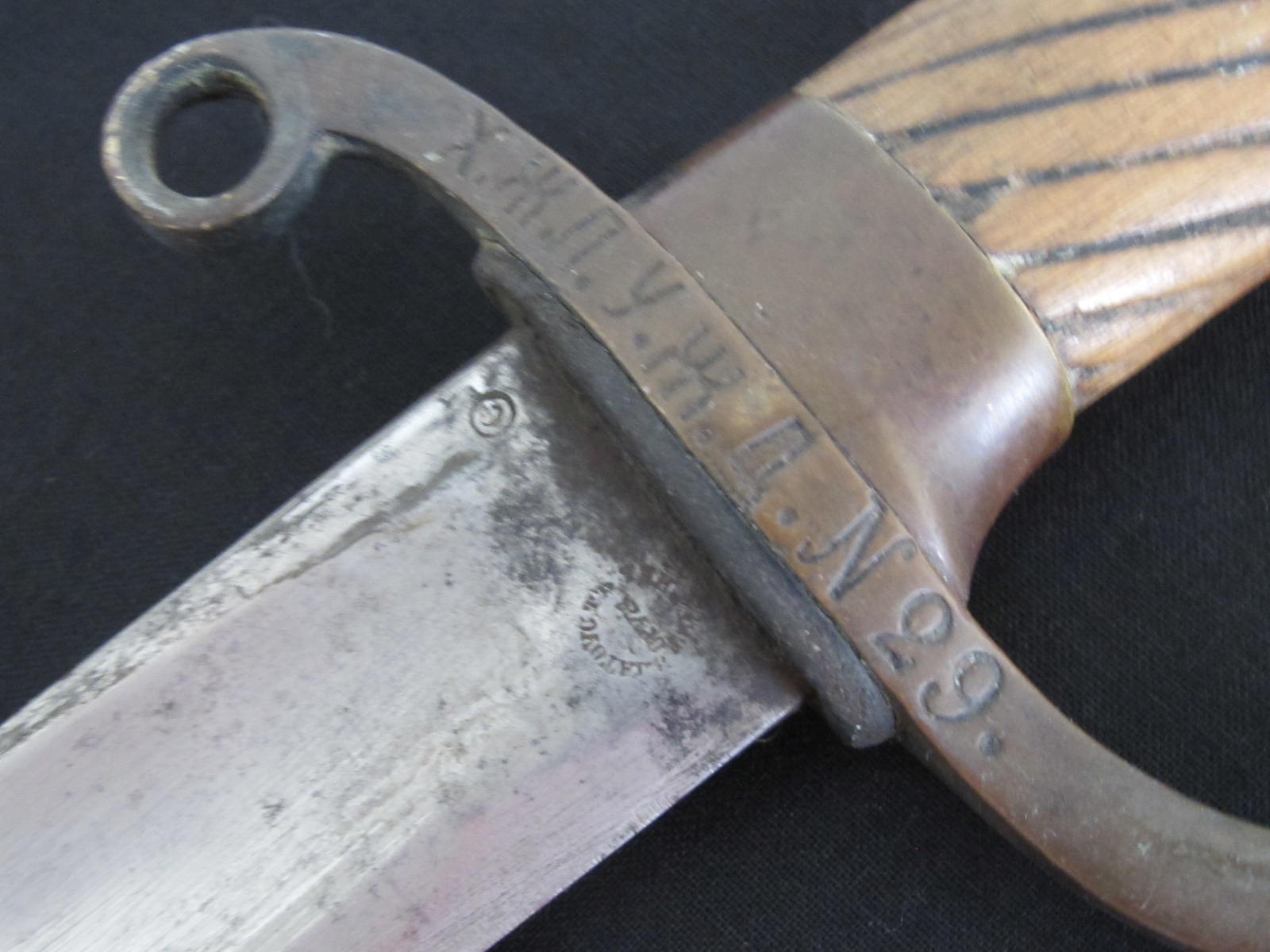 Good example of Imperial Russian 1881 Officers Sabre. Brass guard with wooden grips. Regimental stampings to cross guard. Good blade with much original finish remaining and Russian manufacturers stamp to top. Comes complete with its leather and brass mounted scabbard. A lovely untouched and un-cleaned sword.