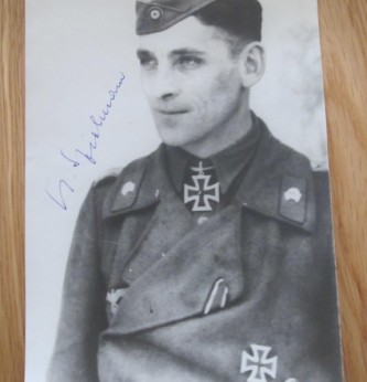 Post War autographed photograph of Major Hans Spielmann, Tank Commander, who won the Knight cross on 27.3.1942 and Oak leaves 27.3.45. He was the 804th recipient.