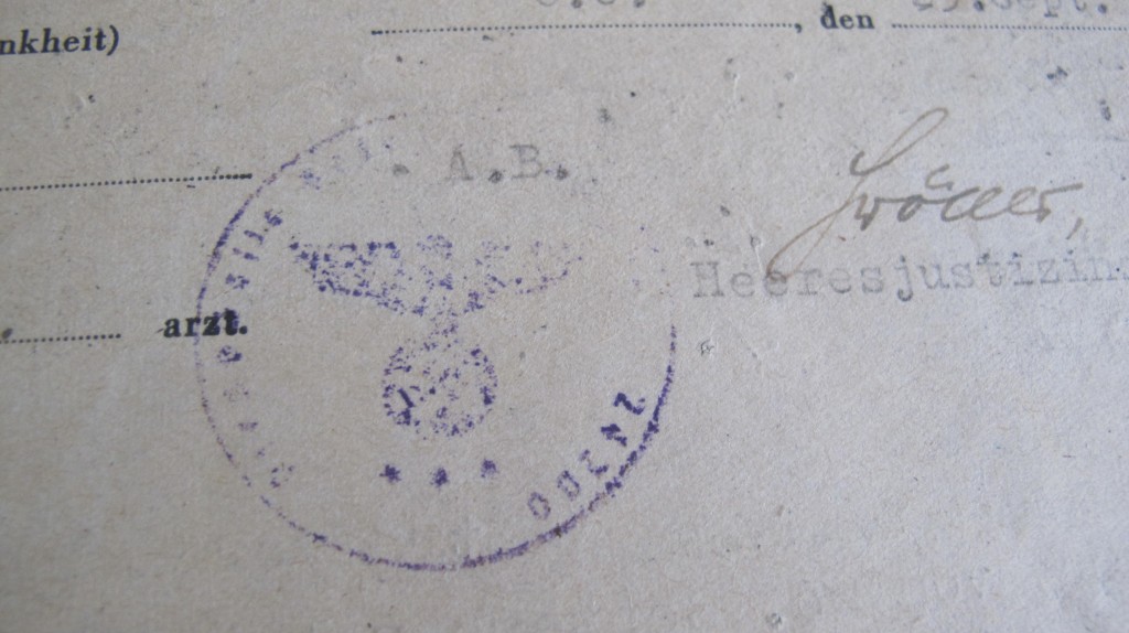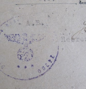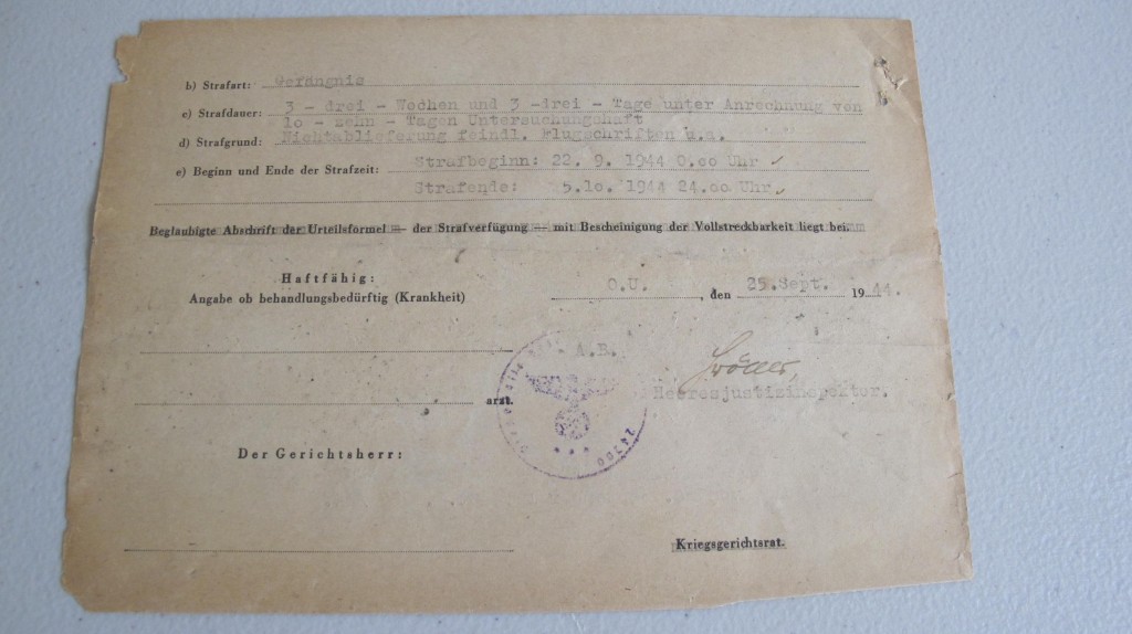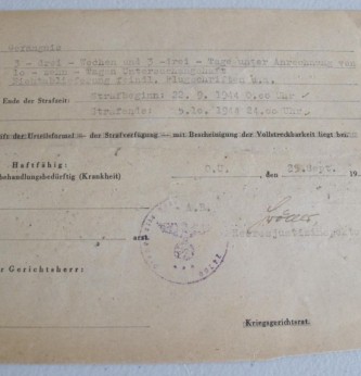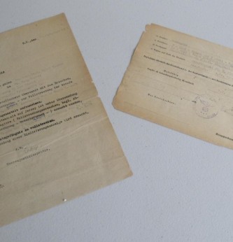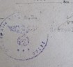 Two documents from the German Military Court on Jersey. Both dated 25 September 1944. Relating to the prosecution of a British National for failure to surrender enemy air dropped leaflets. Stating that the senior German state prosecutor for Jersey will forward court papers and sentence of three weeks and three days. Sentence to begin 22.9.1944. Document bears the unit stamp of staff of the 319th Infantry Division based in Guernsey. Scarce and interesting paperwork.