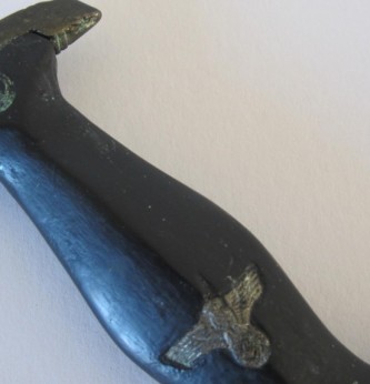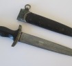 1950s manufactured replica SS Mans dagger. Excellent black grip with eagle and SS rune inisignia. Back of lower chape marked with SS runes and membership Number 19725. Blade with SS motto and RZM & makers mark. Correct black scabbard with nickel mounts. Heavy age patina finish. A good collection filler or mannequin display piece.