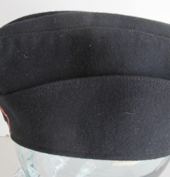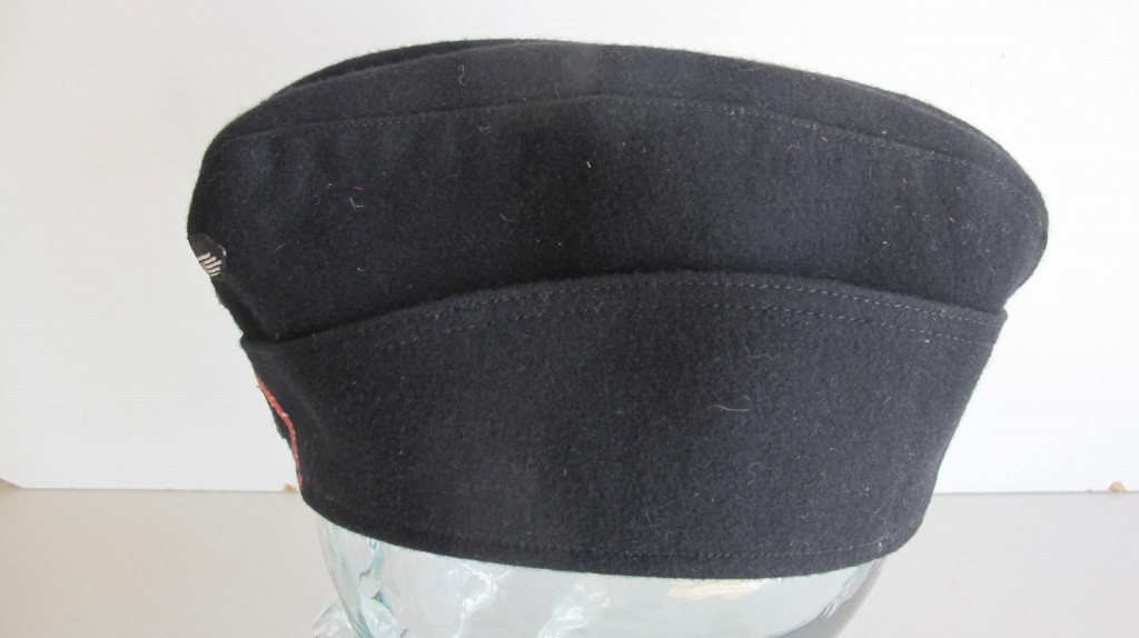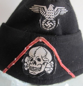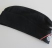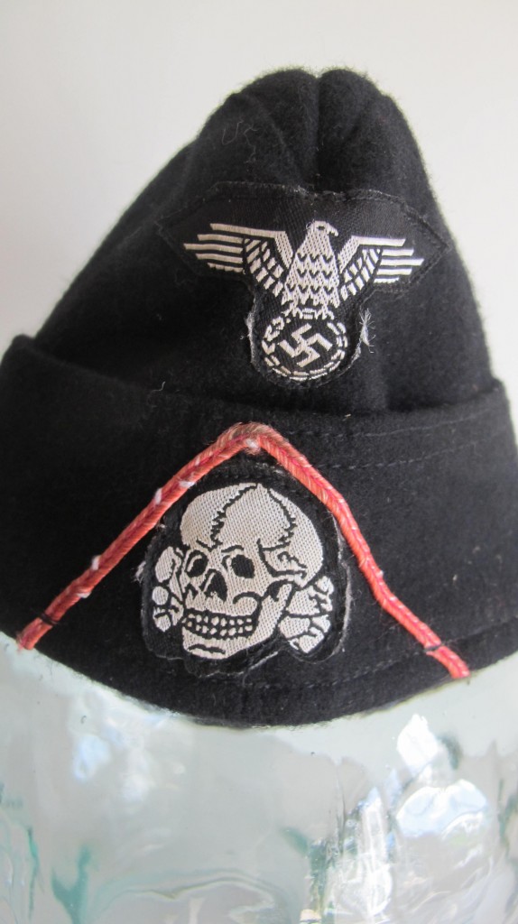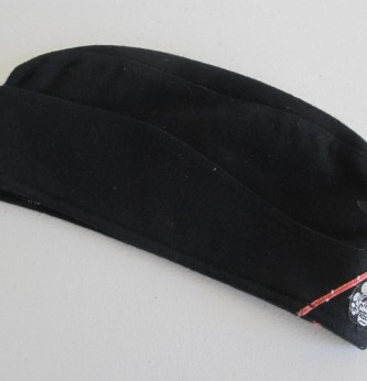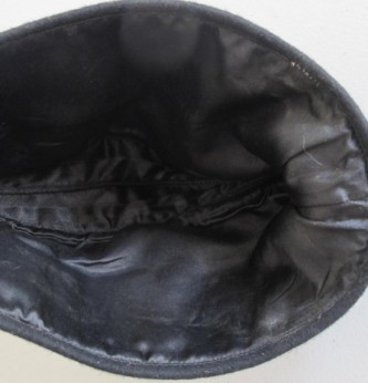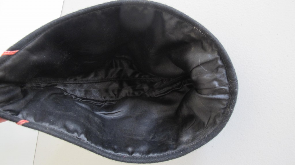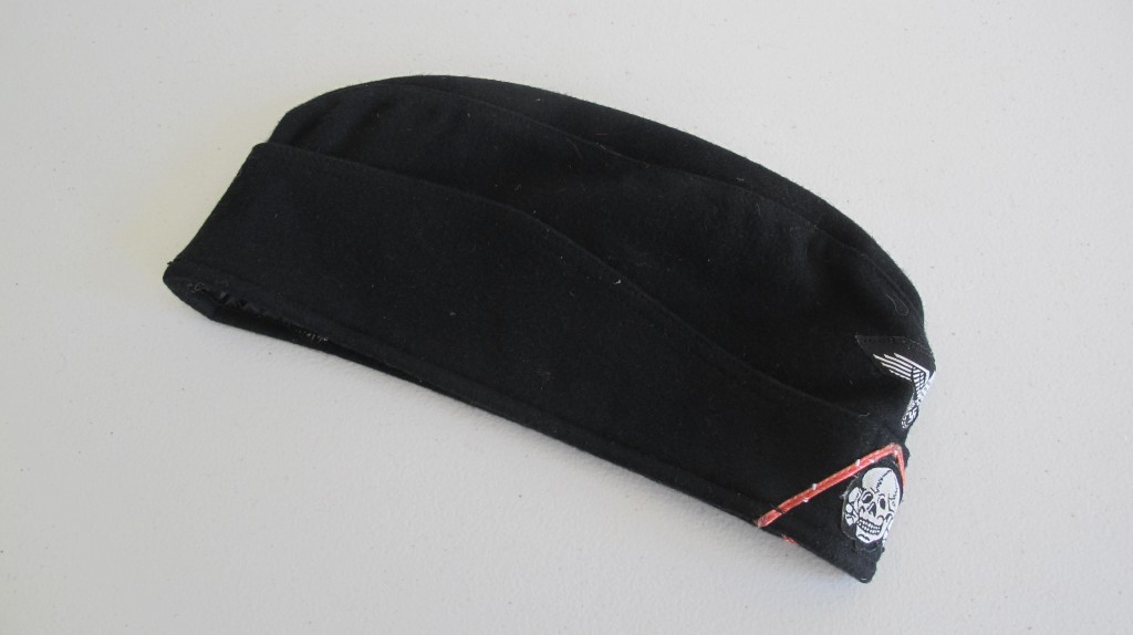 Third Reich style SS black Panzer side cap. Battle reinactors example in black wood cloth with silver bevo insignia and pink waffenfarbe. Black silk lining to inside. A good reproduction example. Ideal for collection filler or battle reinactor. Note if original would sell for over £1800.