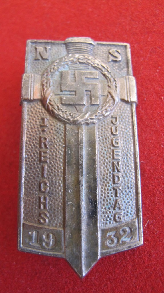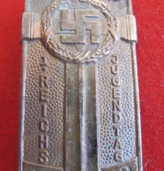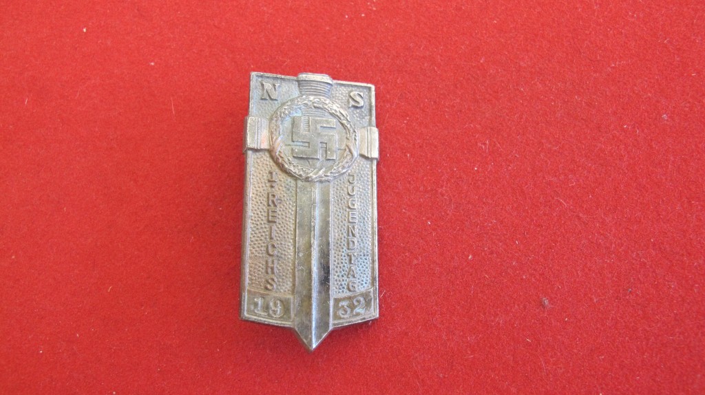 Scarce white metal badge issued to the Hitler Youth who participated in the lst Hitler Youth National day. Thee badges were presented to all who took part. It could be worn on the left breast pocket. Complete with pin back fixing and in good condition. Similar example seen on Pg 62 of The Hitler Youth by Hallmark Publications. A scarce and seldom found badge.