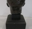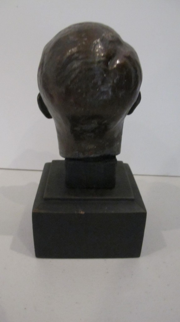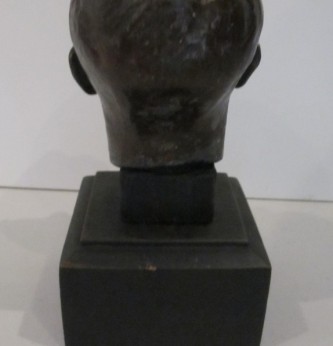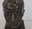 Third Reich Adolf Hitler desk top bust. Measures from head to base 15cm. Bronzed finish over white metal. On stepped wooden base. Base of head with artists signature but un-clear. Good overall condition with just minor age wear to finish.