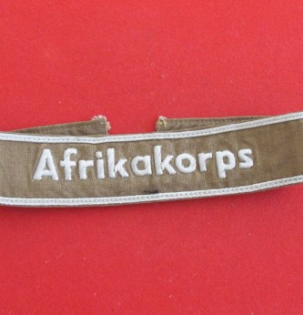 Third Reich Afrika Korps Army Officers private purchase cuff band. Interesting variation in brown canvas type material with machine embroidered silver wire Afrika Korps. Silver edging to top and bottom. Uniform removed example in excellent condition. Full length example. An interesting variation cuff band.