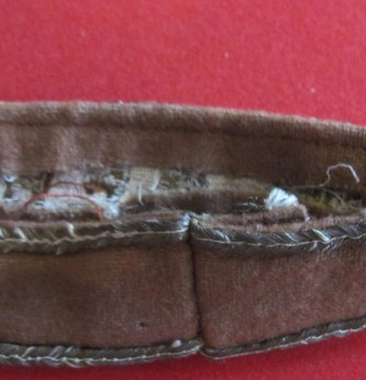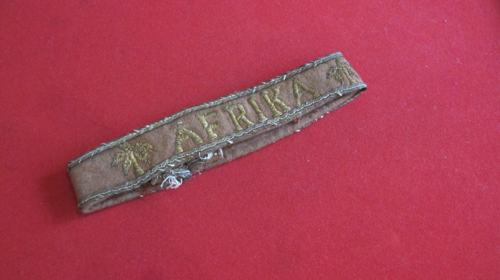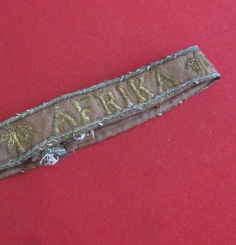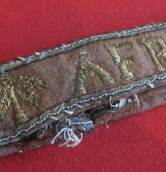 Scarce and seldom found uniform removed private purchase Afrika Officers cuff band. Brown wool with gold piping and gold wire palm trees with Afrika to centre. Removed from uniform and full length. A seldom found bazar made example.
