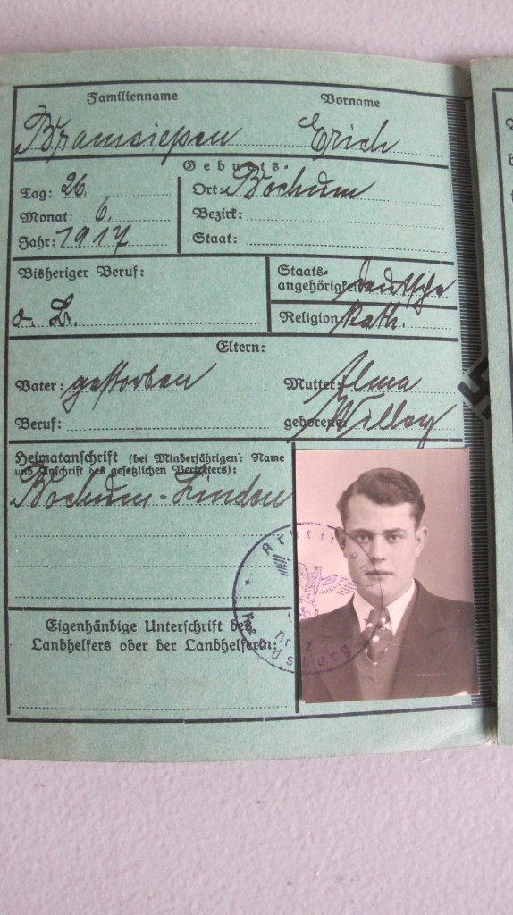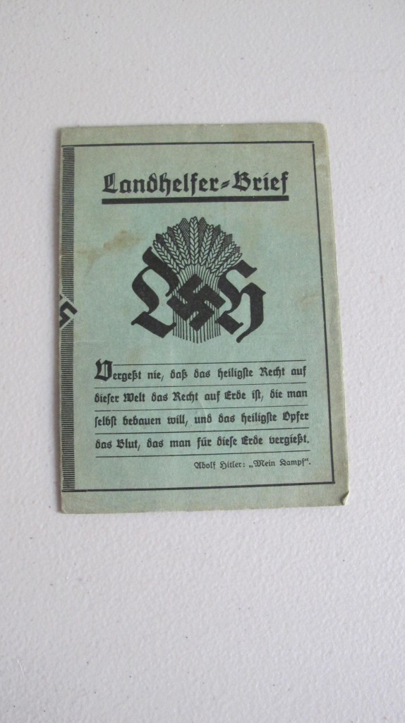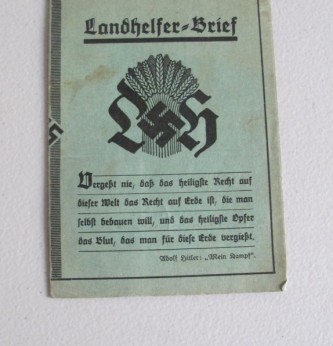 Interesting pass for a 19 year old Eric Braunsieper, issued in 1936 for 12 months service. Green paper pass with photo ID. from the German Labour Association. Carried by assistance. This scheme was organised by the NSDAP for extra farming labour. This was to produce food and show the importance of Blood and Soil to the German people.