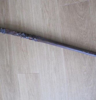 Rare exceptionally carved Wolchow stock commemorating one mans service on the Russian Front. Top carved handle with large eagle and swastika, Iron cross to opposing side and marked with area Jlmenlee and date 1943. Opposite side carved with Russian church. Measures approximately 42 inches in length and has metal spike tip for walking to end. Superior quality example.