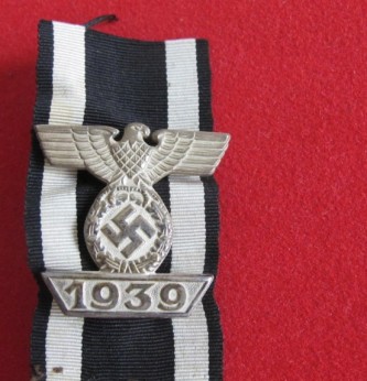 Third Reich Bar to Iron Cross 2nd Class. Retaining much original silvered wash finish and four prong fixings to revere. Mounted on WWI ribbon. Comes complete with original packet of issue. Interestingly pencilled to back NAZI IRON CROSS EAGLE BADGE. Probably labelled by the veteran at time of picking up.