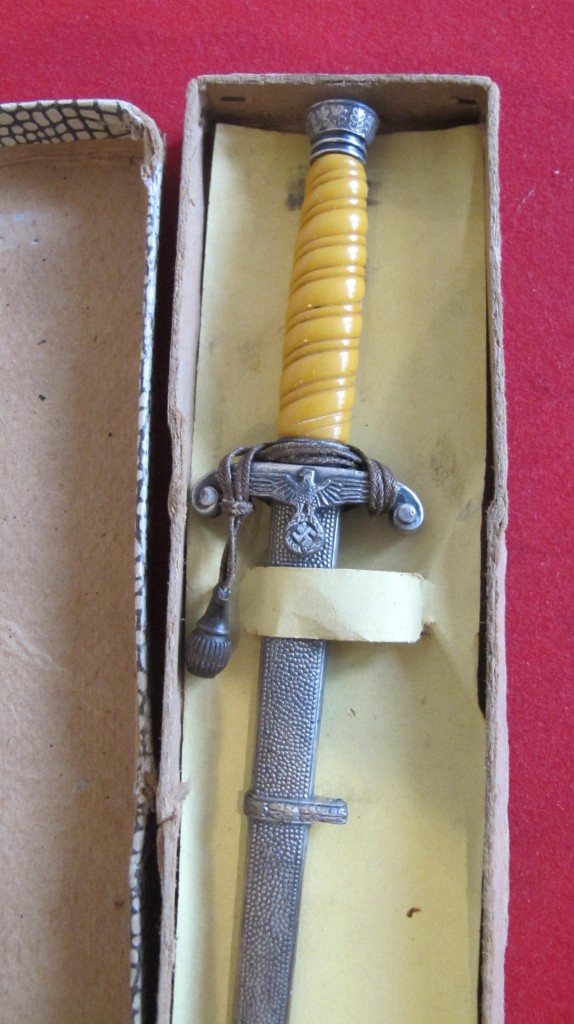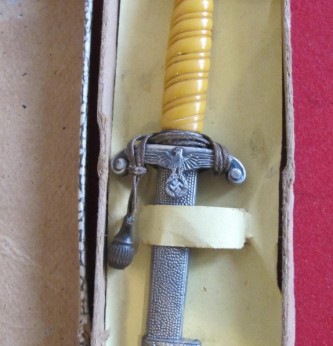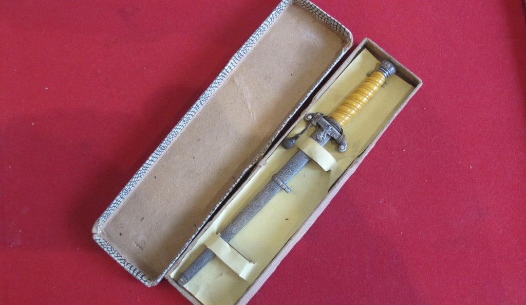 Miniature WWII German Army Officers Dagger. Excellent example with deep yellow grip with miniature knot attached. Blade in excellent condition and retains all its original polish. Contained in its original box of issue. Overall measures 19.5cm. An excellent example of these salesman’s samples and seldom found with original box of issue.
