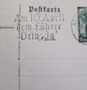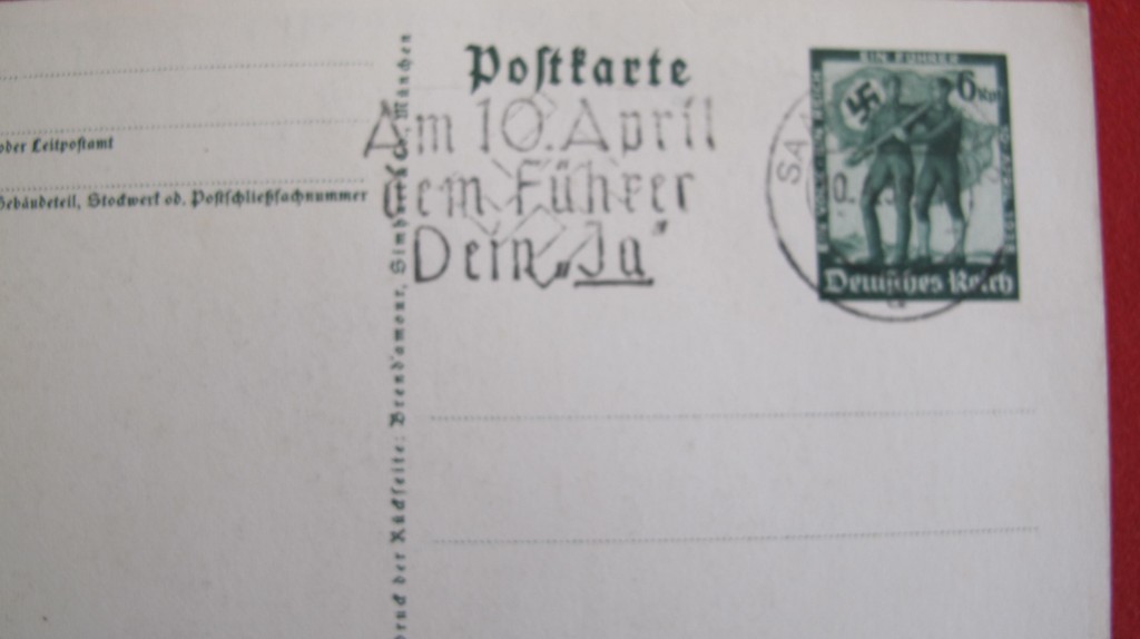 Interesting commemorative postcard for the upcoming Plebiscite in Austria. Showing eagle and swastika with profile of Hitler over Austria. Excellent condition with commemorative stamping to reverse.