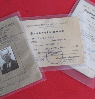 The Third document is a certification from “Hamburg Area Economics Chamber handwork/Artisan Office to Heyland as a former owner of an Electrical Engineers Business in Hamburg from June 1936-March 1937 and a member of the chamber until his imprisonment. Certificate issue 9 June 1945.