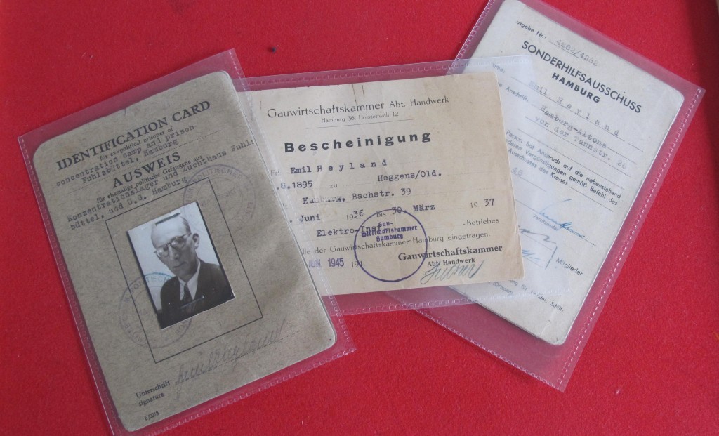 The first is a bi-lingual photo Identity card in English and German to Emil Heyland a German Political Prisoner aged 51. from 1936-40 in a Concentration Camp and liberated from Fuhlsbüttel Prison by the British. Card issued 8.12.1946. Reverse shows details of imprisonment and prison number. Signed by the Committee.