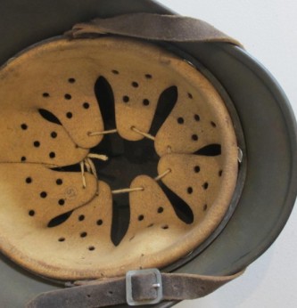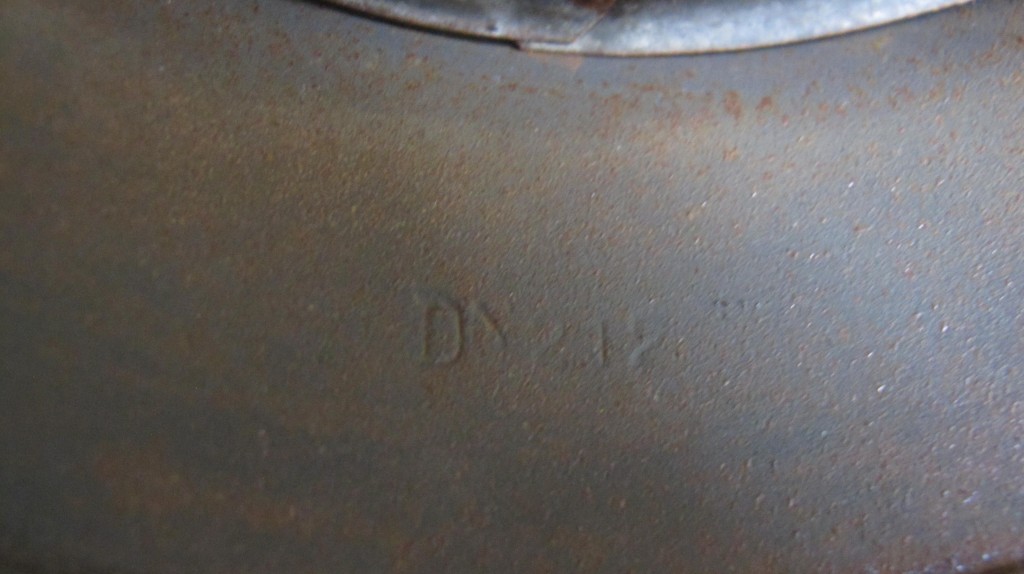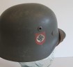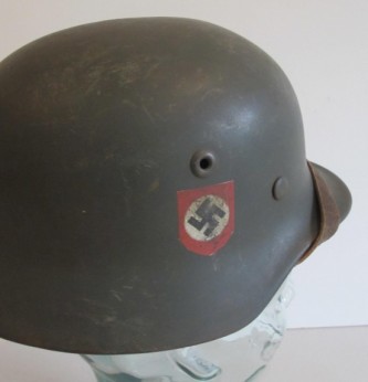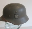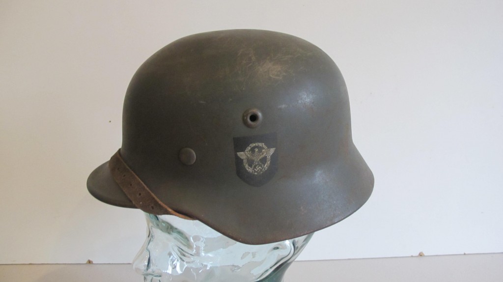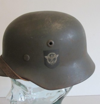 Third Reich Police double decal combat helmet. 98% of its field grey paint finish. Comes complete with 990% of its un-bordered Police decal and 80% of Party decal. Excellent liner and chin strap. Size marked 57. Later replacement chin strap. Rim marked Q64. Good overall example.