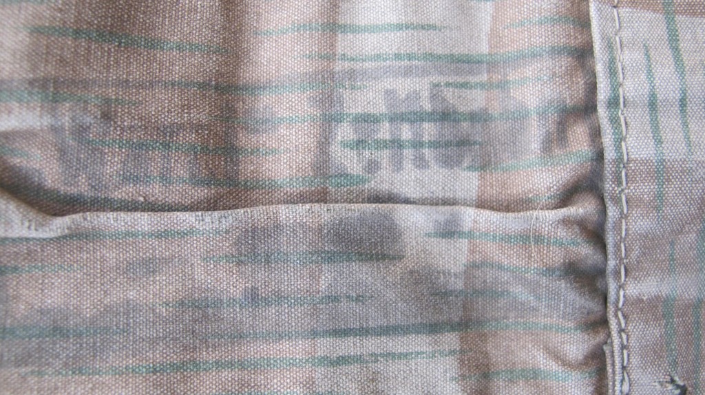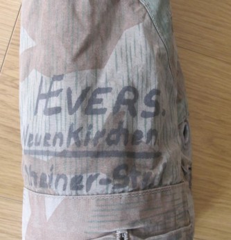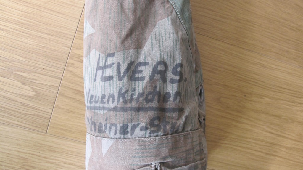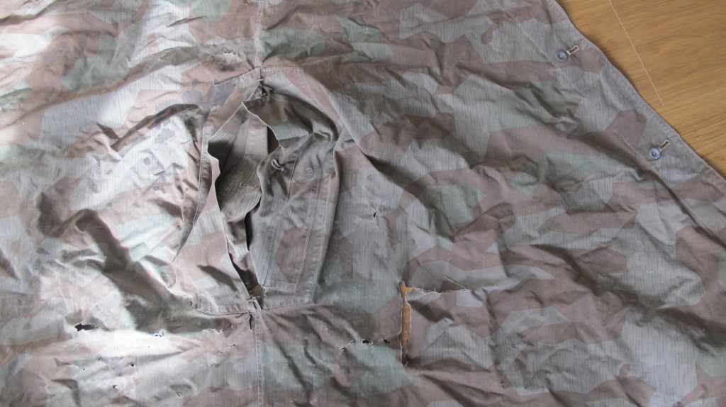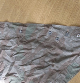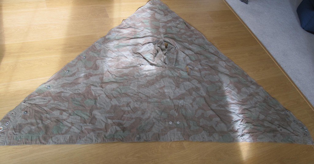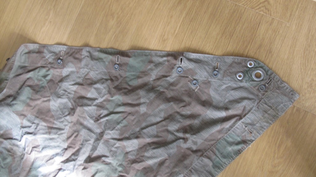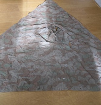 WWII German Army Camouflage poncho. Complete with all buttons and rings. Original owners name marked to edge of poncho. Small service tear and some minor damage from combat use. However, generally good sound condition and with clear splinter pattern design.