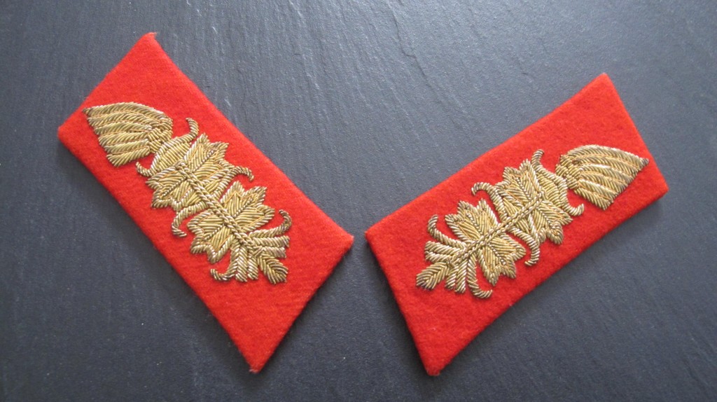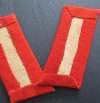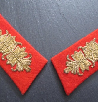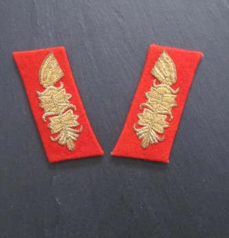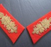 Good matched pair of uniform removed Third Reich German Army Generals Collar Patches. Heavy gold wire construction on red felt background. A nice example of these high ranking collar patches.