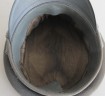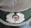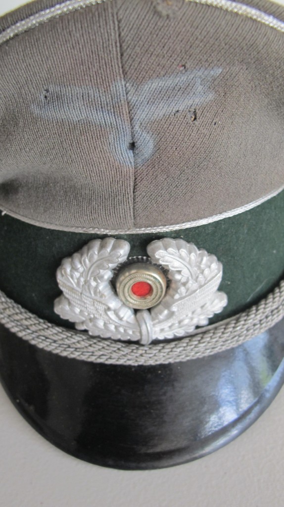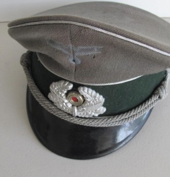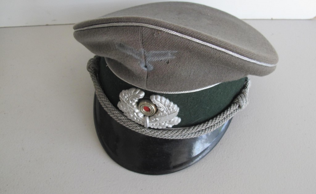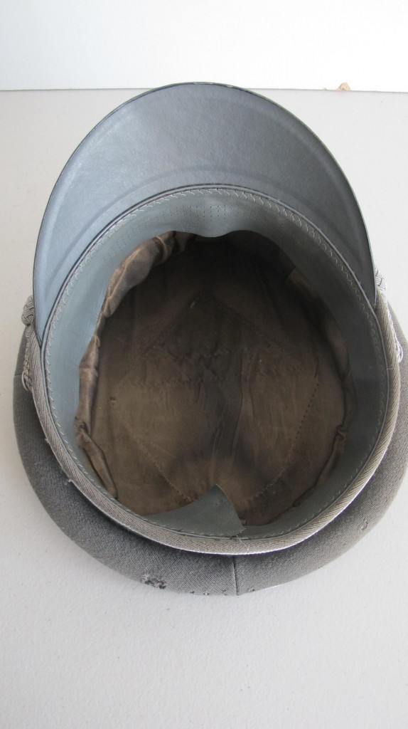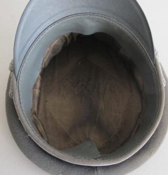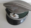 Rare German Army Railway Security Officers peaked cap. Field grey with lower green band. Silver piping. Correct pattern officers cockade with winged wheel. Clear marks where cap eagle has been removed. Some moth nips to back crown of cap and top. Complete with leather liner and grey silk inner. A seldom found cap. Priced lower to reflect condition.
