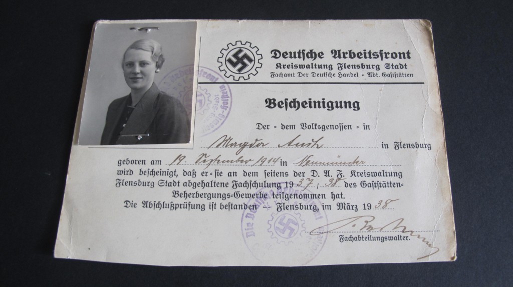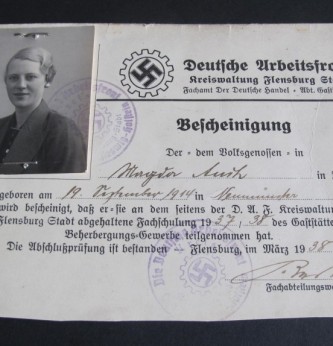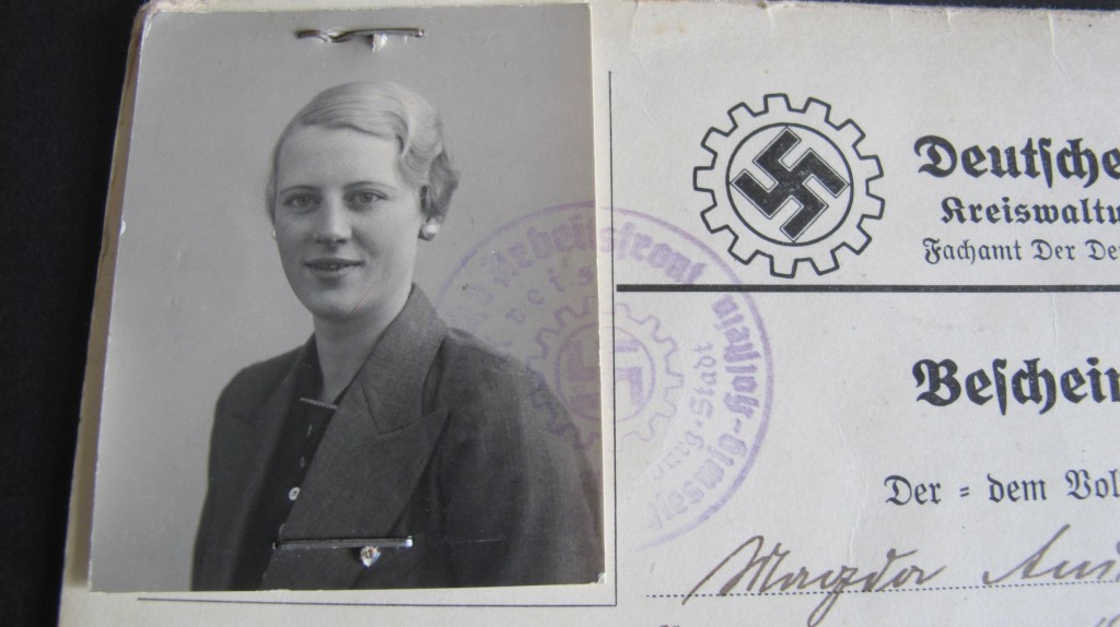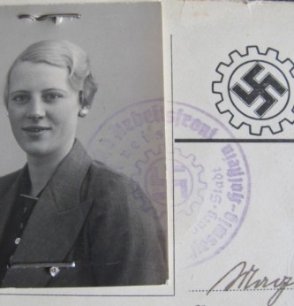 Interesting Third Reich female employee of the German labour front ID card. Issued March 1938. Good condition.