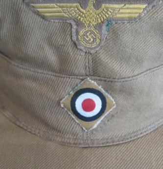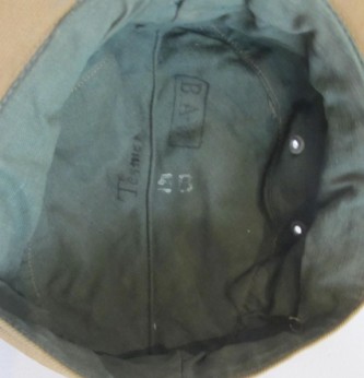 Third Reich German tropical marine ski cap. Brown herringbone cloth construction with tropical backed bevo Marine cap eagle to front. Complete with its original green cloth lining. Stamped BAW and original owners name inked to inside and size mark 58. Excellent overall condition for this large sized ski cap.