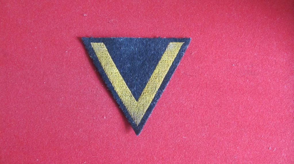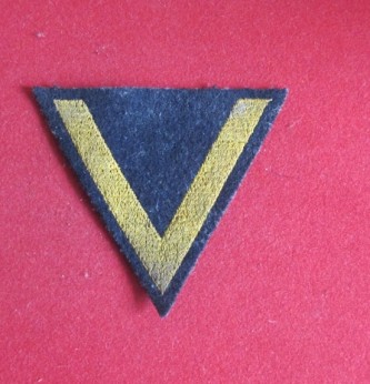 German Naval Seamans rank stripe. Blue cloth with gold V. As worn on the deck jacket. Uniform removed item in good condition.