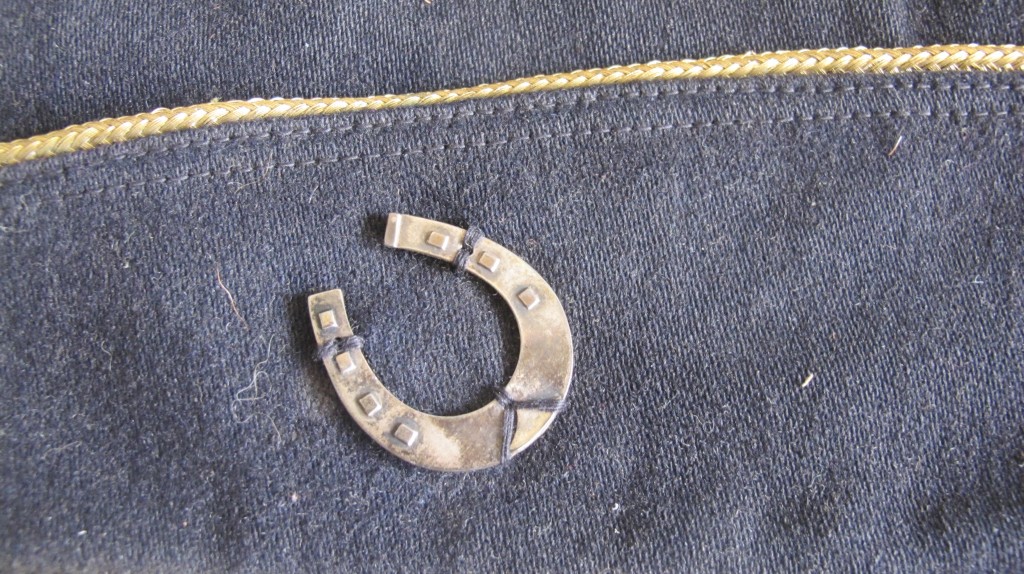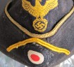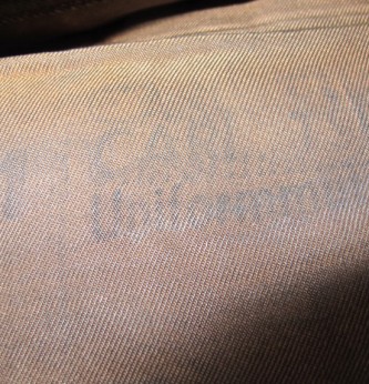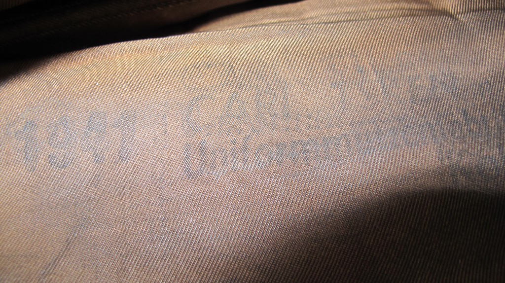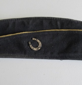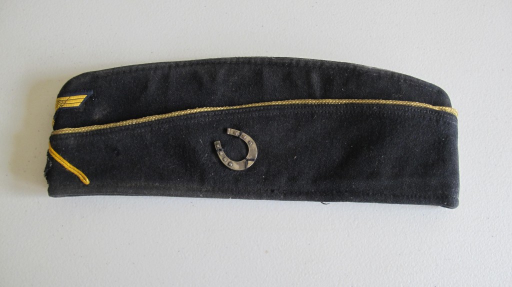 Third Reich German Naval U Boat NCOs/Officers side cap. Bevo Naval cockade and eagle and with gold piping. U boat tradition badge to side of horseshoe. Grey silk lining. Size marked 59 and dated 1941. Maker marked Carl ?- remainder not readable due to service wear. Good over condition. A nice “been there” cap.