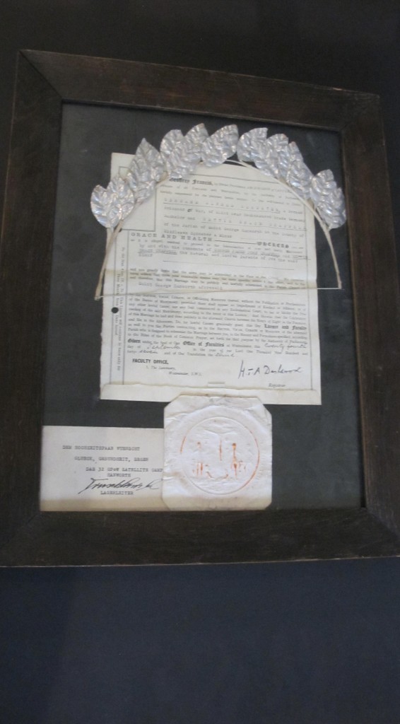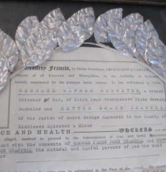 A most unusual WWII German POW wedding certificate. Commemorating a wedding between and English woman and a German POW from the German Satellite camp Hanworth. Framed with her wedding silver paper head wreath and certificate from camp. Signed by the registrar in 1947. Contained in its period frame. Measures  38 x 47cm.