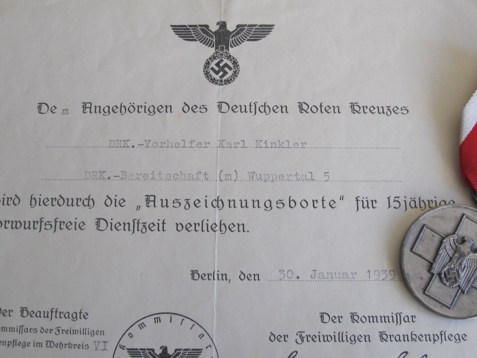 Interesting grouping to a Senior Auxiliary Red Cross member. Consisting of Award Document for 15 years Long Service, awarded 30.1.1939 to DRK.Vorhelfer Karl Kinkler, promotion document to Senior Auxiliary dated 20.4.1939, his original enamelled Red Cross stick pin for wear on civilian clothing and his DRK Social Welfare medal complete with ribbon and in good condition. A good interesting complete grouping.