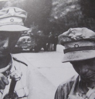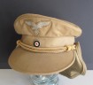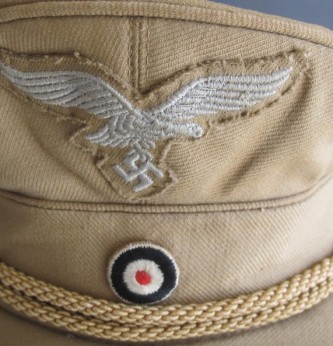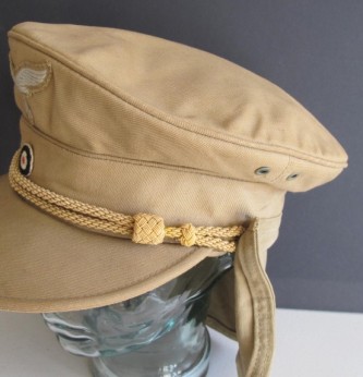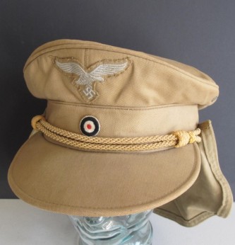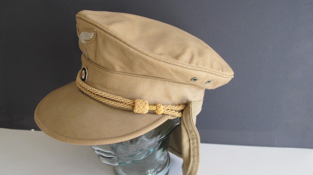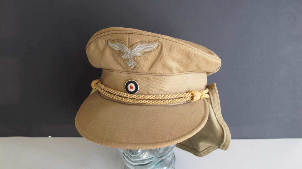 Excellent example of a lst Pattern Herman Meyer Officers tropical cap. Red cloth lining with size mark 60 and makers stamping plus date 1942. Typical of this Schellenberg caps with extra ring around central band. Complete with its period sewn breast eagle – a common feature on this make of cap and single cockade. Similar cap shown on Pg 218 of “Afrika Korps” 41-42 by David Bunch and Daniel Fisher. Completed with its buttons to back for attachment of neck flap. Buttons with remains of tropical paint finish. A nice example of this rare cap.