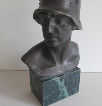 Super Third Reich Hero Series bronze bust. Shows helmeted soldier on marble base. Measures 30cm in height approx. Good condition. Contained on its original green speckled marble base. An impressive display item.