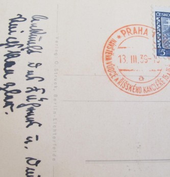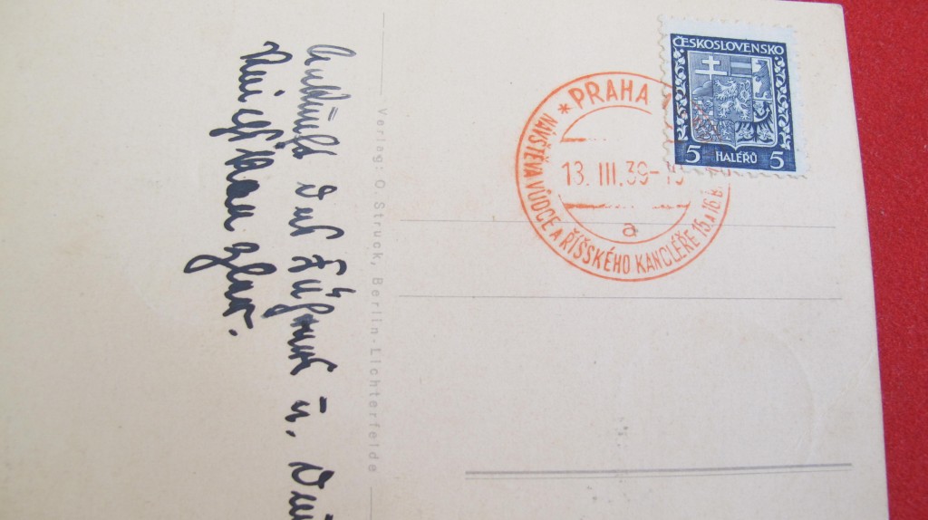 Interesting commemorative postcard posted in occupied Czechoslovakia. Shows Hitler in Party Uniform wearing cap. Commemorative stamp to reverse. Good conditioin.