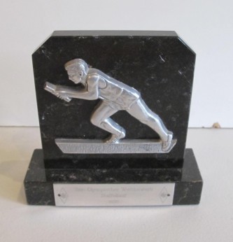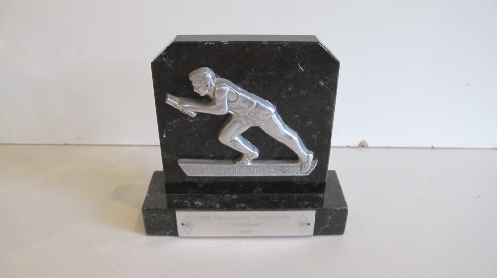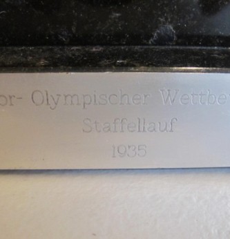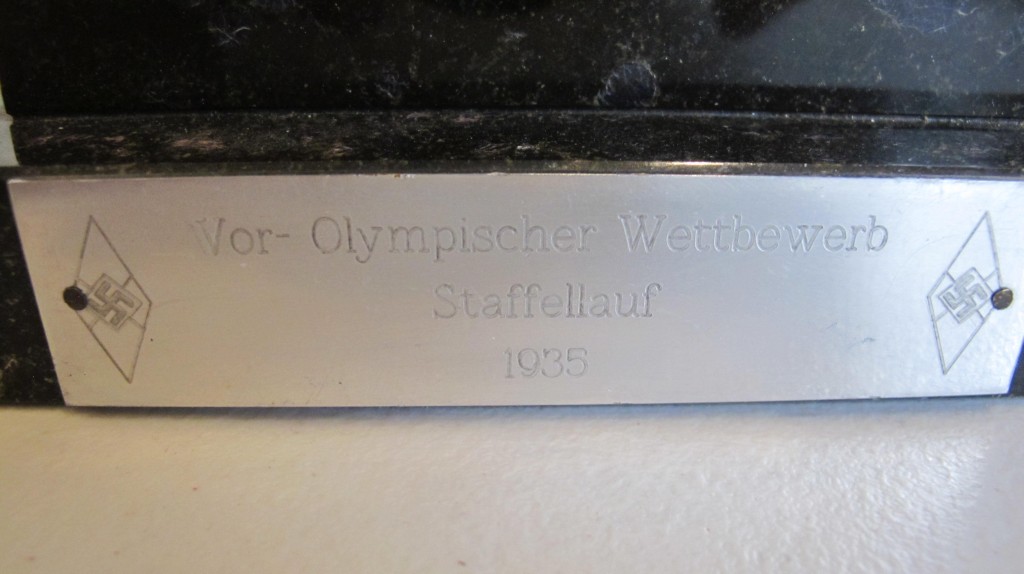 Black marble and white metal Third Reich Hitler Youth Sports Day competition plaque. Measures 15cm high x 12cm width. Base 15cm width. Complete with presentation plaque to front marked “Vor olympischer wettbewerb staffellauf 1935″. This translates as (“Pre-Olympic relay race 1935″).