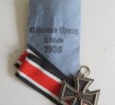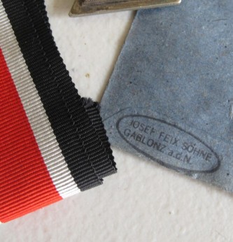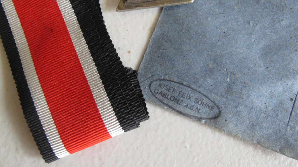 Third Reich Iron Cross 2nd Class. Complete with its original blue paper packet of issue. Three piece construction. Maker marked Josef Feix Sohne, Gablonz. Complete with full length ribbon. Cross with some service wear.
