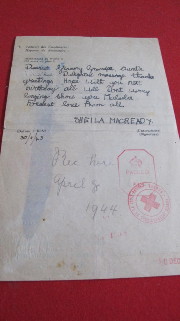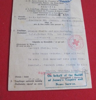 Interesting German Red Cross letter sent from Geneva to a family resident in Germany in the German Occupied Channel Islands. Despatched on 17.7.43 and received in Geneva 6.10.43 then received in Jersey in April 1944. Interesting to note that there was a chemical wash used on both sides of the form by the Germans to detect secret messages. Good condition for age. Nice piece of Home Front paperwork. Very few of these letter survived.