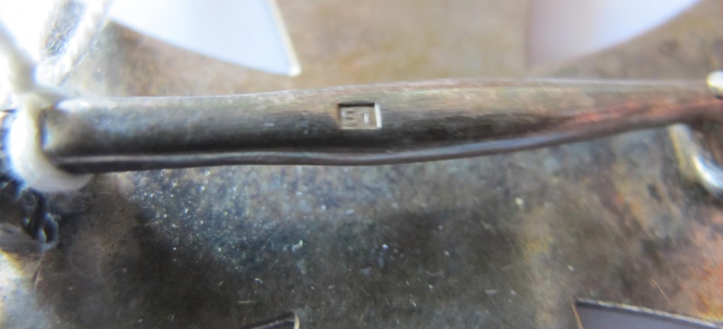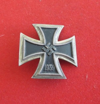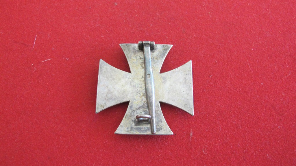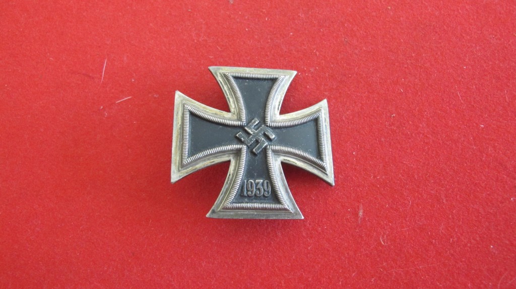 Good Iron Cross lst Class bowed example. Multi piece construction. Much original black finish to cross. Complete with correct pattern pin and hook fixing. Pin maker marked ”51″  by E. Ferd. Wiedmann of Frankfurt am Main.