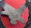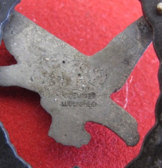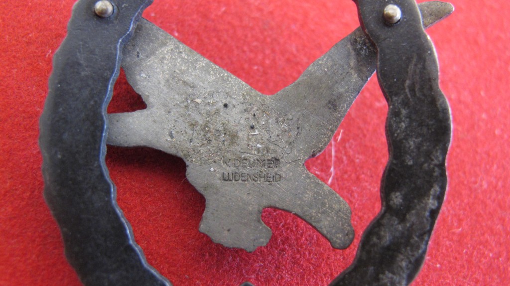 Scarce two piece construction Luftwaffe Air Gunner qualification badge. Compete with pin and hook fixing. Blackened oak leaf wreath with silver eagle. Issued in 1944. Maker marked to reverse Deumer. A nice example of this scarce and seldom found badge.