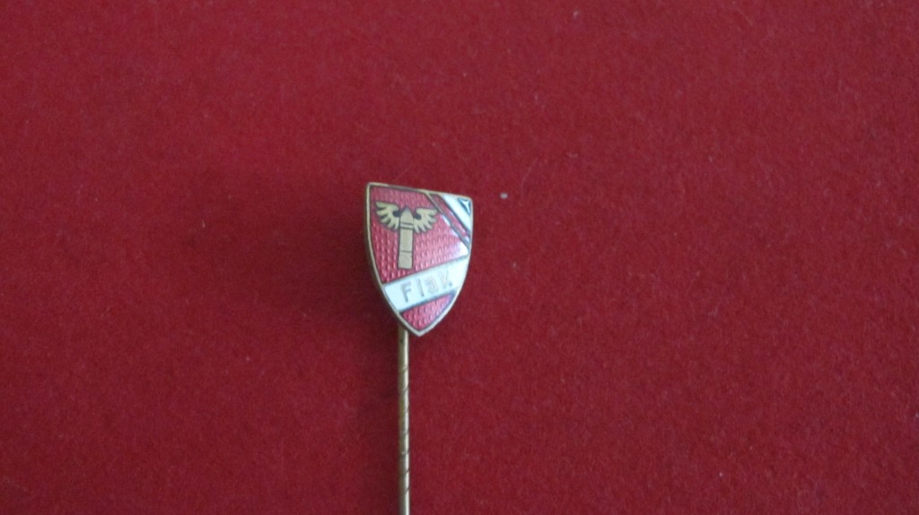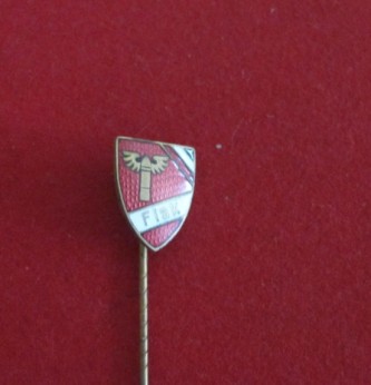 Third Reich Luftwaffe enamelled Flak Regiment stick pin. Red/white/black enamel German colours to corner. Winged cannon shell to centre. Complete with long attachment pin. Good condition. As worn on regimental and civilian clothing to show attachment to regiment.