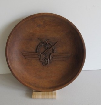 Scarce carved wooden Salver featuring to centre carved wreath with Luftwaffe droop tail eagle on winged railway badge. This unique salver commemorating service on the Armoured train units that were used to guard various high ranking Third Reich personalities, eg Hitler, Goring & Himmler etc when onboard. Bowl measures 26.5cm in diameter. Complete with hanging display loop to reverse.