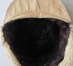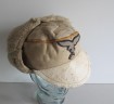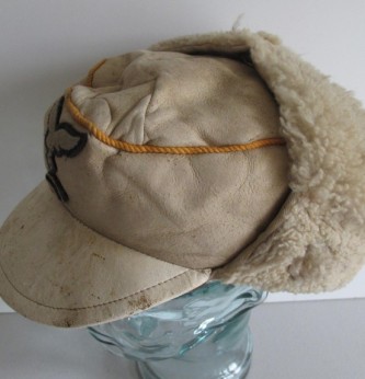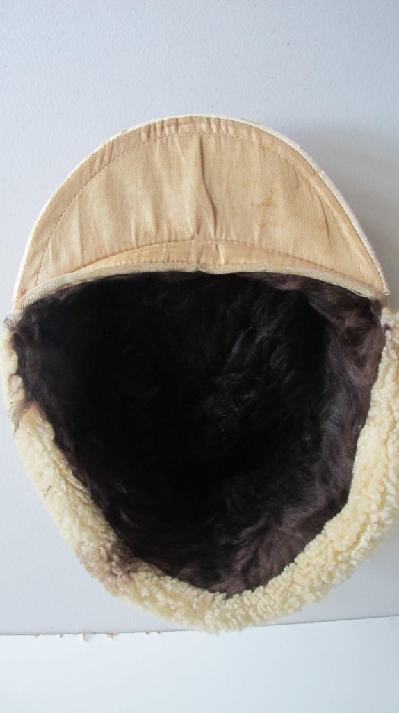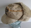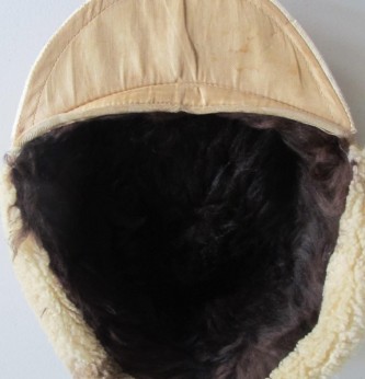Unusual variation of the Luftwaffe Special issue Russian Front ski cap. White wool cap with pull down sheepskin lined ear muffs. Period sewn Luftwaffe eagle and cockade to front. Crown with yellow cord piping denoting Flight Section. Good “been there” issued example in sound condition.