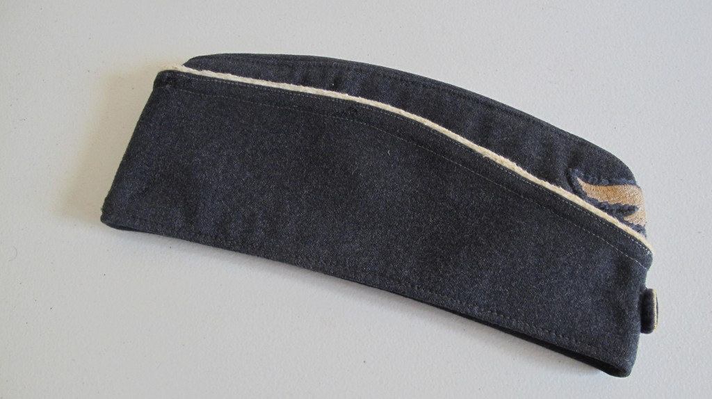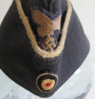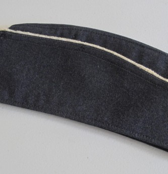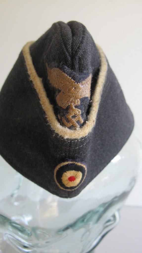 Third Reich Luftwaffe Herman Goring Division Other Ranks side cap. White piped cap with hand embroidered eagle and swastika and cockade to front. Grey cloth lined with manufacturers stamping to side and date 1940. Overall good condition. Believe private purchase quality side cap.