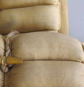 Scarce WWII Luftwaffe Mae West. Cord leg ties and complete with all toggles and buckles. Yellow material in good condition. Due to its construction these were named by the Luftwaffe pilots “sausage Mae West”. Open back style introduced in 1943. Excellent example with issue ink stamp to inside. Popular with bomber crews.