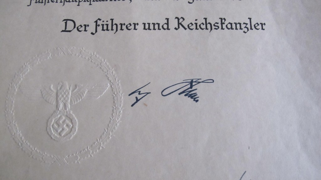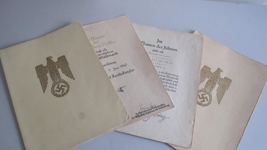 Magnificent grouping of four documents awarded to Dr Carl Walbrach, who was Commander of Luftwaffe Reserve Light Flak Unit 911. Consisting of his promotion document as a Reserve Captain in Field Luftwaffe Regiment dated 26.9.1939, discharge certificate from duty as a library official in the Ministry of Science, Education and Public Information dated 7.6.1940. Plus his large promotion document in its gold blocked cream folder with eagle and swastika to centre. Promoting him from Captain to Major and dated 1.7.1940. Ink signature to bottom of Goring which was signed at the Fuhrer HQ. A second promotion document in its gold embossed folder promoting him from Major to Lt Colonel and dated 24.8.1942. This last document has Hitler’s signature and counter signed by Goring at the Fuhrer HQ. A fabulous grouping to a high ranking Luftwaffe Colonel. All documents in good condition.