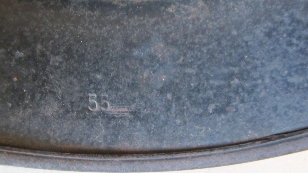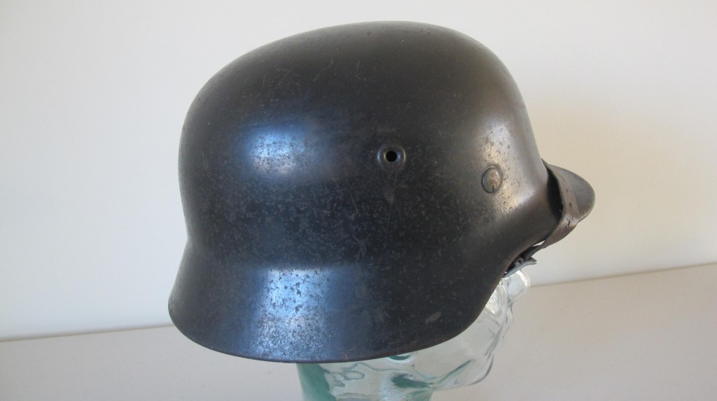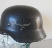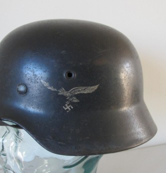 Third Reich Luftwaffe M40 single decal combat helmet. Complete with its original 56 size marked leather liner with original cord. Excellent chin strap. Retains 98% of its original dark blue Luftwaffe blue/grey paint finish. 95% of its Luftwaffe single decal with just minor abrasions to one wing. An excellent untouched Luftwaffe single decal combat helmet. Back skirt marked 55 and side marked ET64? An excellent untouched example of a Luftwaffe veteran bring back combat helmet.