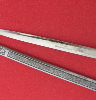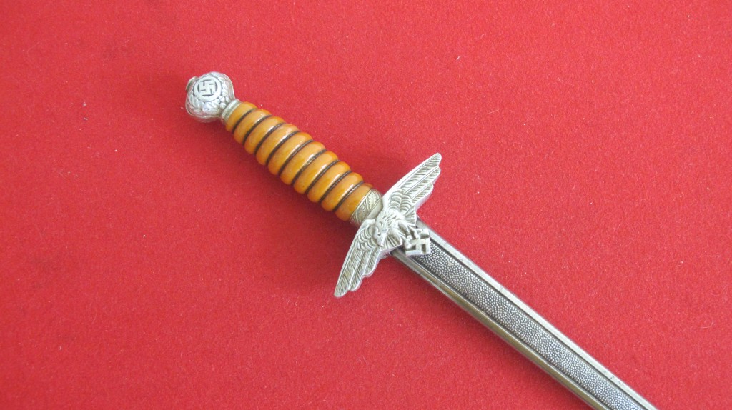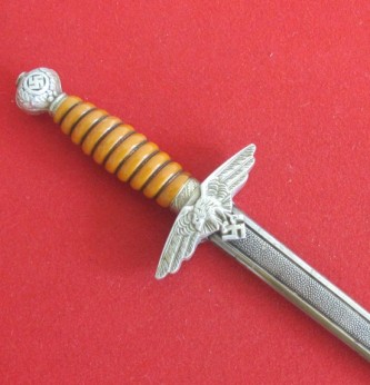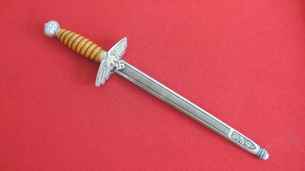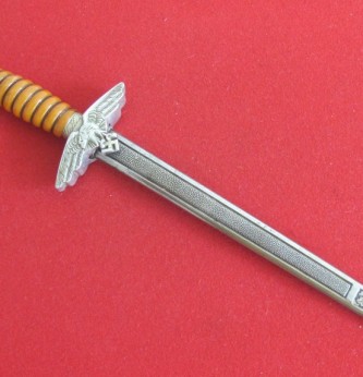 Third Reich 2nd Model Luftwaffe Salesmans miniature dagger. Deep orange grip with Luftwaffe eagle cross guard. Excellent blade by SMF, Solingen. Blade with factory inscription. Much original finish to blad. Correct miniature scabbard. Measures 24.5 cm in overall length.