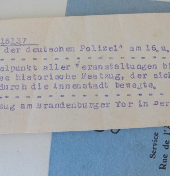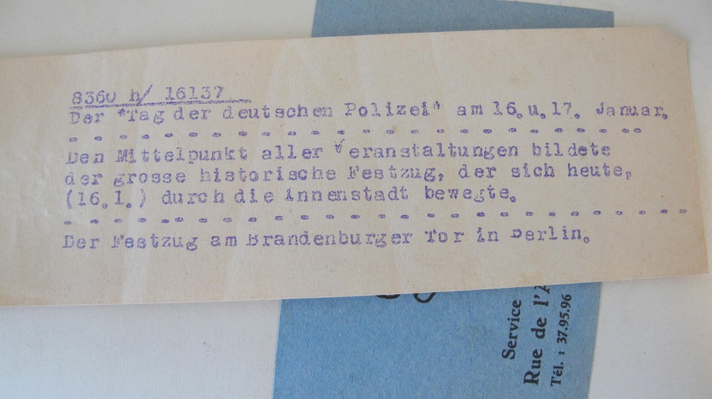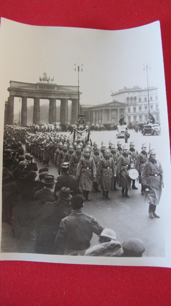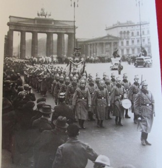 13 x 18cm Press photo showing day of the German Police parading past the Brandenburg Gate. Nice clear shot showing shakos and Jingling Jonnie being carried. Ex Brian Davis collection. Good condition.