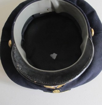 Excellent example blue wool Third Reich Captains peaked cap Large blue flannel top (typical to Naval caps). Complete with gold wire period applied cockade and eagle and swastika. Single row of gold wire oak leaves to peak. Complete with its correct pattern chin strap and side buttons with German anchors. Excellent grey leather sweatband and black silk lining to inside. Overall a nice example of this scarce peaked cap in excellent condition.