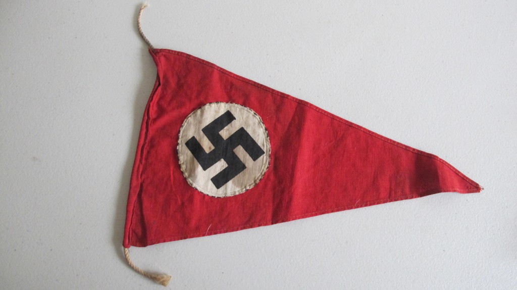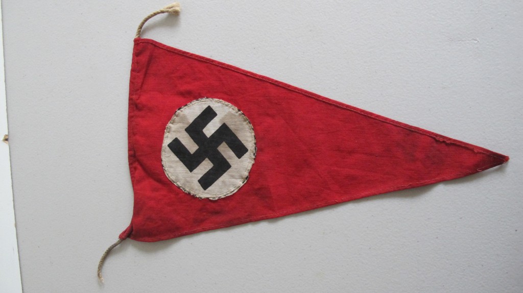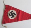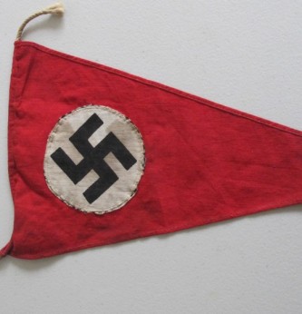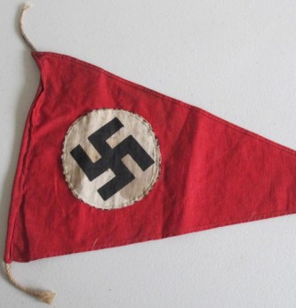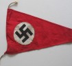 Third Reich NSDAP two piece construction Party car pennant. Red cotton. Complete with string ties. Good condition with printed swastika to centre. As used on all party official vehicles.