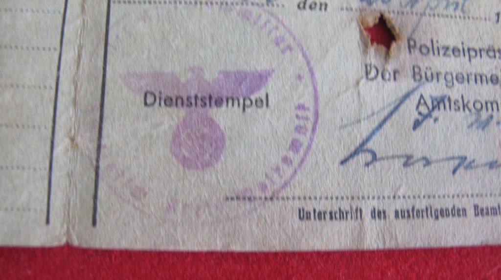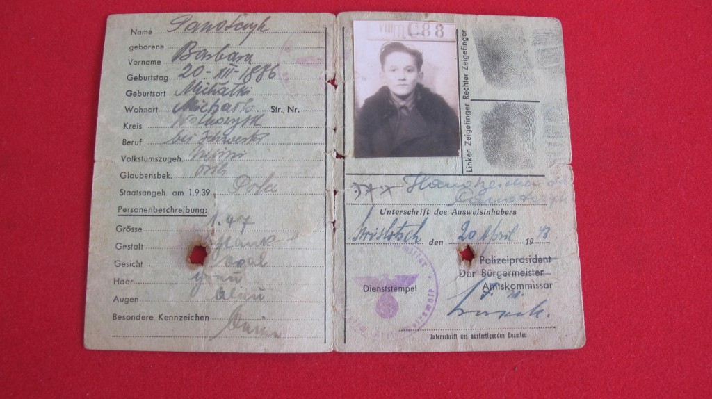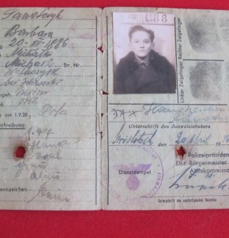 Interesting occupied Poland workers ID card. Shows workers photograph and prison ID number and finger prints. Signed by the occupying Police commander. Pass shows issue wear and Police ID stampings.
