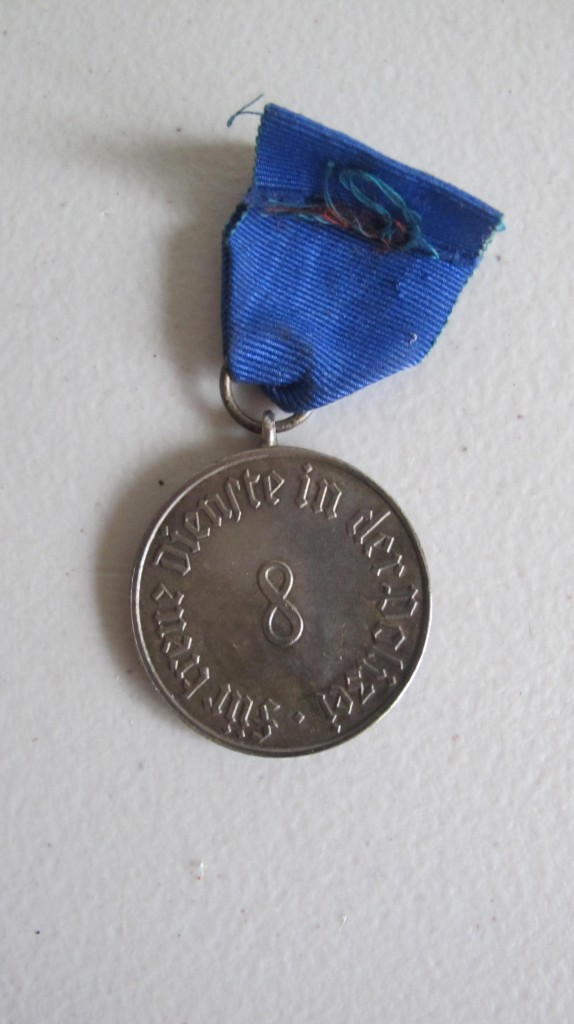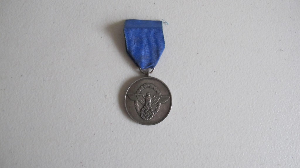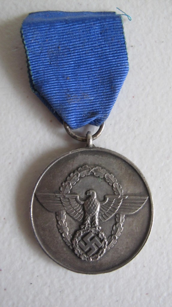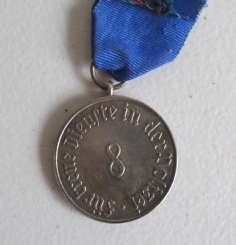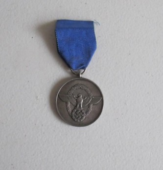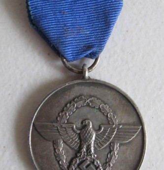 Third Reich 8 Year Police Service Medal. Complete with correct pattern blue watered silk ribbon. Silver medal for 8 Years Police service. Good overall condition.