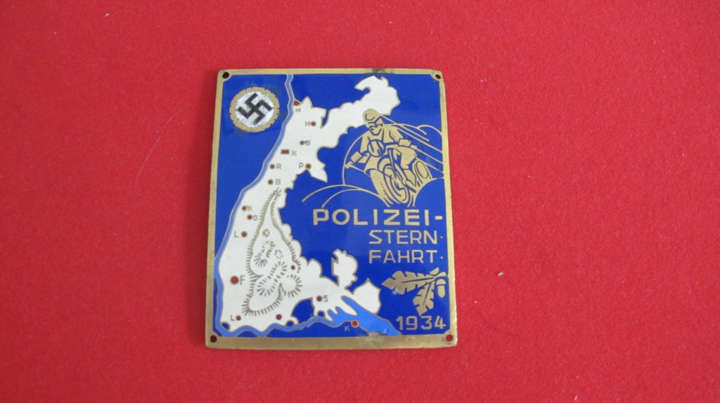 Interesting Third Reich non-portable award for Police Motorbike race held in 1934. Blue and gold enamel. Shows German motorcyclist racing with enamelled swastika in gold oak leaf wreath. Good condition. Measures 7 x 9 cm approx. Hole to each corner for fixing.