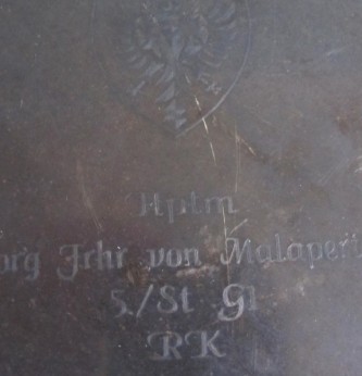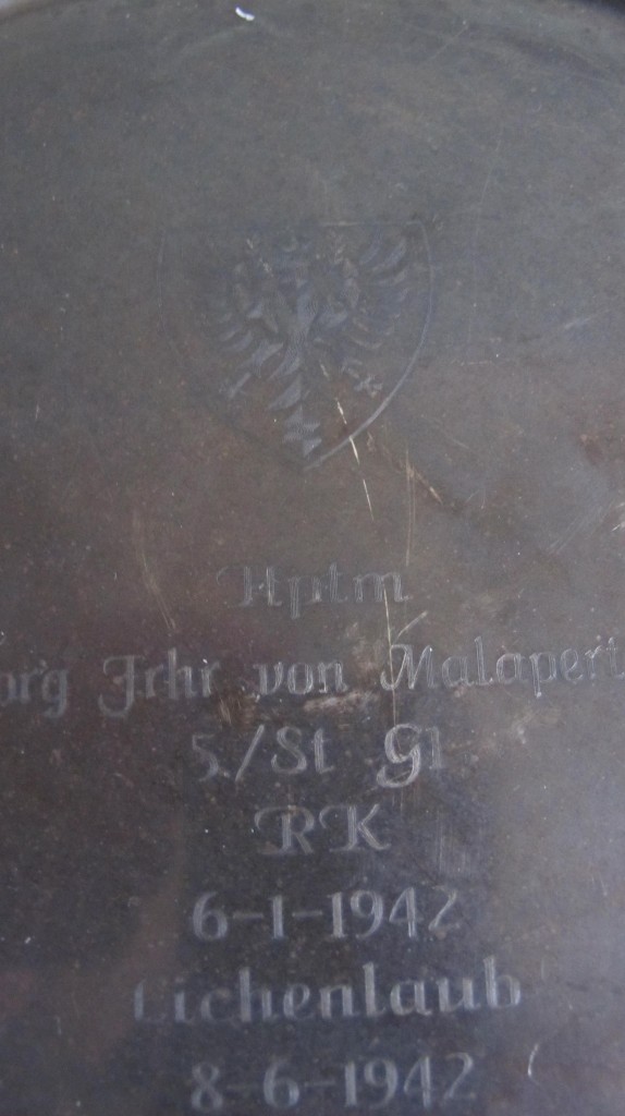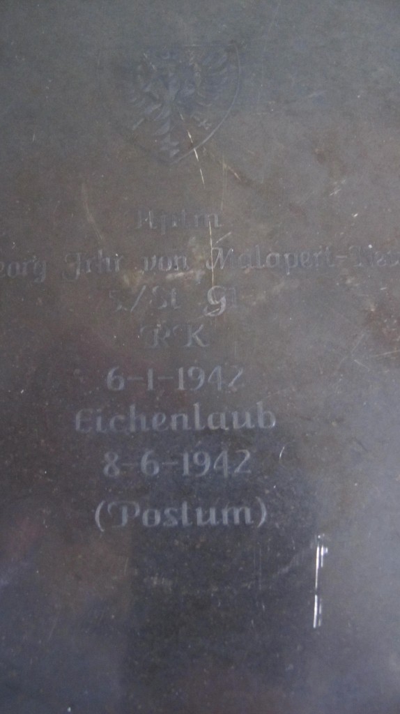 On 21st May 1942, von Malapert and his observer Oberfeldwebel Otto Mees started their plane from the airfield in Sechtschinskaja, for an attack on a bridge near Moscow. After von Malapert had destroyed the bridge his plane was hit by anti-aircraft fire and he had to make a crash landing. He landed in the no-mansland between the German and Soviet front between Sechtschinskaja and Moscow. Walking they tried to reach their own lines. During the last jump to reach their own defences, von Malapert was probably shot by a sniper. Otto Mees succeeded in reaching the German lines. An infantry unit later managed to reach von Malapert’s body and brought it to the nearby base at Sechtschinskaja, where he was buried.