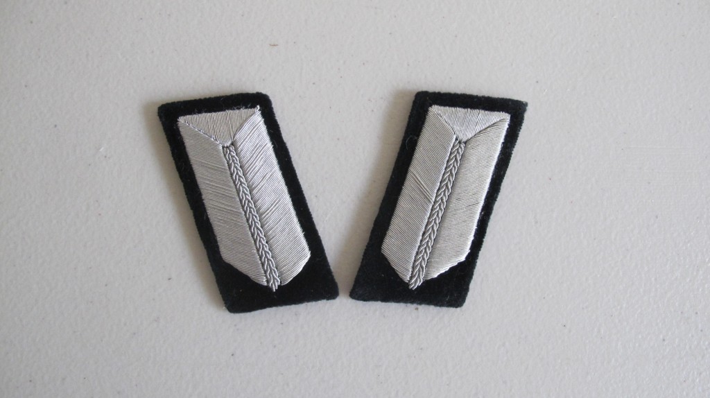 Pair of mint collar patches for RAD Unterfeldmeister. Heavy silver bullion on black velvet backing. 2nd pattern instituted in1940. Uniform removed examples. Ex Brian Davis collection. Shown on plate 8 of Shoulder straps and collar insignia of the RAD.
